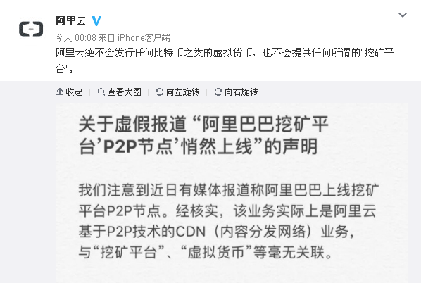 阿里云称经核实,该业务实际上是阿里云基于P2P技术的CDN(内容分发网络)业务,与“挖矿平台”“虚拟货币”等毫无关联。