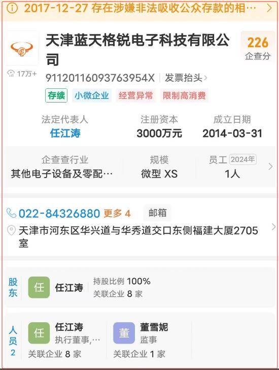 2014年3月31日,逃犯钱志敏彻底抹去“李霞”身份,化名为“花花”,用过去骗来的钱财,在天津注册成立了蓝天格锐电子科技有限公司,摇身一变为女霸总。