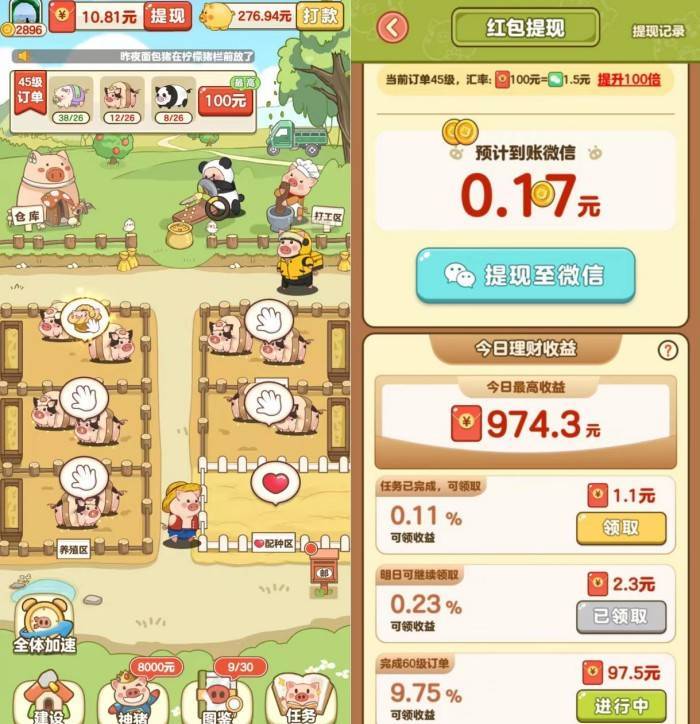 在网上挣钱的正规软件中全民养猪场是不得不提的,这是一款模拟经营游戏,玩家将以养猪为主题,体验从喂养小猪到经营大规模养殖场的全过程。主要赚钱方式是通过把小猪养大后出售换取金币,完成订单即可领取红包,不同等级的订单收益比例在0.21%–95.3%之间。