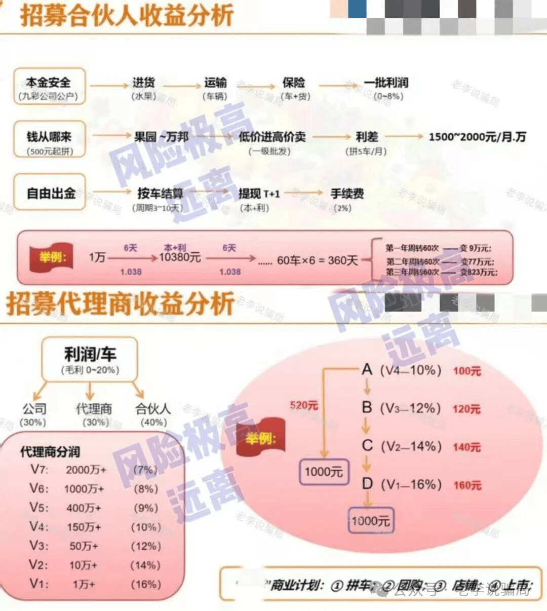 该平台以水果生鲜为包装,推出“合伙拼车方案”,参与金额500元起,宣称可获得0%-8%的每车利润,结算周期为3-10天,提现需收取2%手续费。