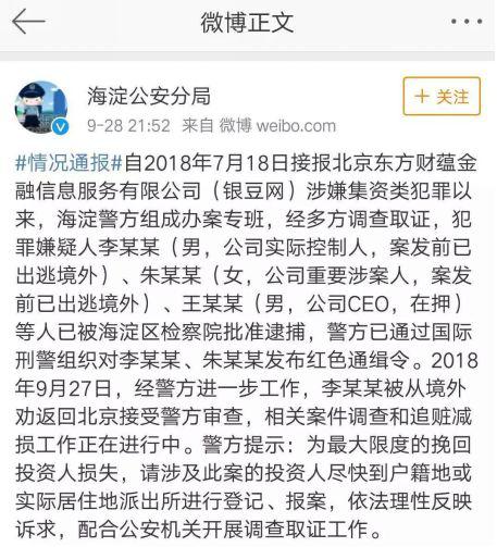 此后仅隔不到一个月,P2P平台“银豆网”爆雷。7月18日,银豆网发布公告称,实际控制人李永刚失联,资金无法兑付,将停止运营。彼时,银豆网累计待还金额共计43.3亿元,待收出借人达23464人。警方通报称,银豆网因涉嫌非法集资被立案调查。